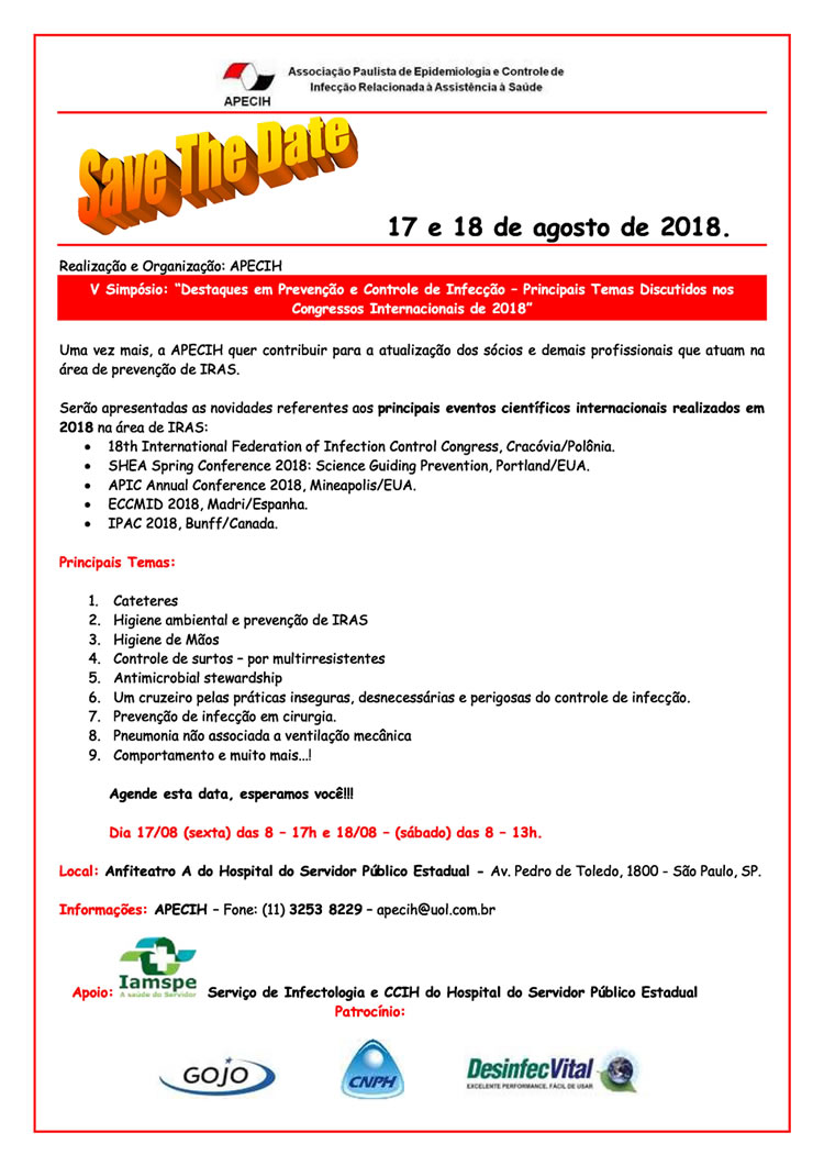 V Simpósio Destaques em Prevenção e Contole de Infecção dos Congressos Internacionais de 2018