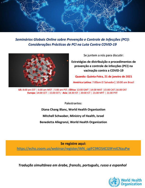 WEBINAR COM CDC, EUA ( 21/01/2021 – 10h00) - Estratégias de distribuição e procedimentos de prevenção e controle de infecções (PCI) na vacinação contra a COVID-19