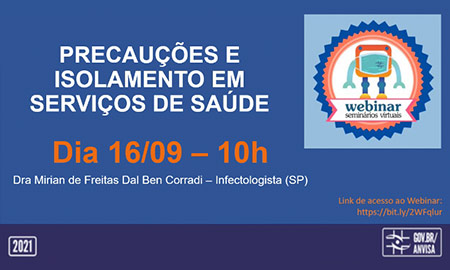 Webinar da GVIMS/GGTES/Anvisa sobre “Precauções e Isolamento em Serviços de Saúde”, que acontecerá na próxima quinta-feira, dia 16/09/2021, às 10h.